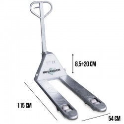 Il transpallet Novamach NL zincato a caldo è progettato per la movimentazione di macchinari e colli fino a 2500 kg in magazzino e industria. La zincatura a caldo della struttura assicura protezione contro corrosione e agenti atmosferici, rendendolo ideale per ambienti umidi e gravosi.
