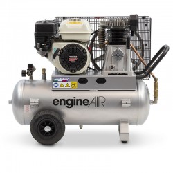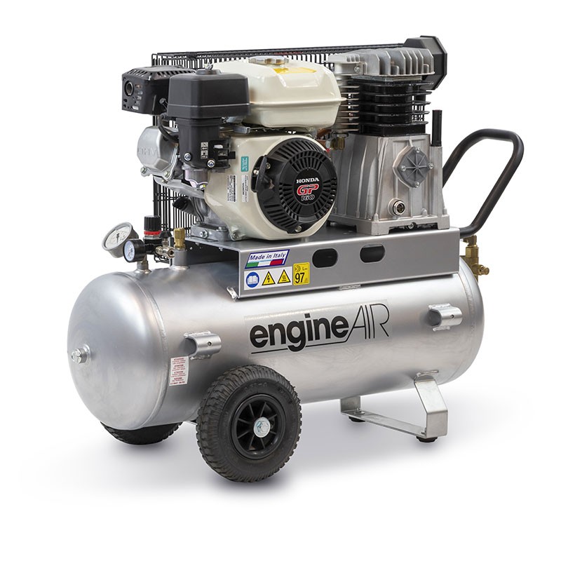 Questo compressore, appartenente alla gamma EngineAir, ha un serbatoio da 50 L ed è alimentato a benzina consentendone l'uso anche in zone senza accesso all'allacciamento elettrico.