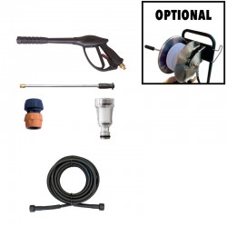 L’idropulitrice è completa di manometro per monitorare la pressione dell’acqua, un filtro acqua ispezionabile per garantire che l’acqua utilizzata sia pulita e priva di impurità, un supporto portalancia di serie per agevolare il lavoro dell’operatore. Infine, è possibile aggiungere un avvolgitubo come optional per una migliore gestione e conservazione del tubo dell’acqua.
