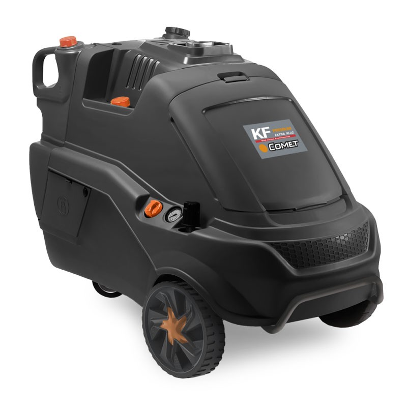 Comet KF Extra è alimentata da un motore professionale a 4 poli a 1400 giri/min, con serbatoio gasolio da 19 L e consumo combustibile della caldaia pari a 6,4 L/h (8 L/h nelle versione 10.22), garantendo autonomia prolungata e affidabilità nel lavoro continuo. La caldaia verticale dispone di un corpo in acciaio inox con serpentina a doppia spirale, sistema elettronico di regolazione della temperatura con basso pendolamento del valore impostato e protezione termica integrata. Il bruciatore è azionato da flussostato con partenza ritardata, mentre la valvola di sicurezza e il sistema Total Stop ritardato garantiscono operazioni sicure anche in caso di inattività prolungata.