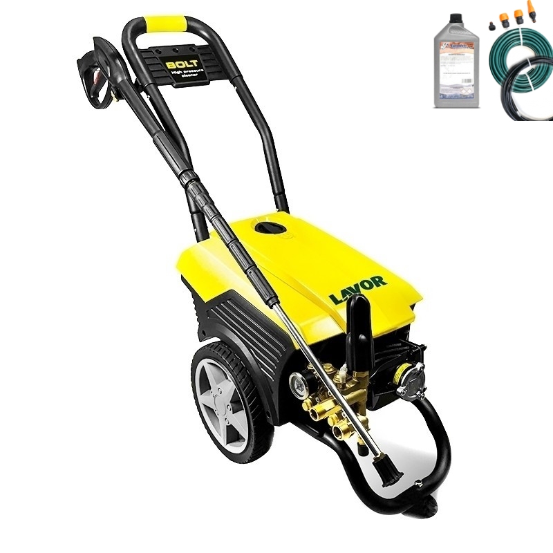 Lavor Bolt 1510 GL ha un motore elettrico da 1450 rpm a 4 poli, con protezione termica. Con 3 pistoni in rivestimento ceramico, testata in ottone e valvola by pass incorporata. Valvole aspirazione e mandata in inox. Con manometro in bagno glicerina.