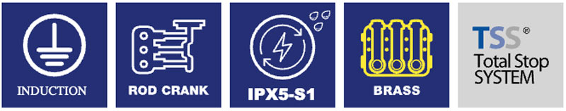 - Pompa a 3 pistoni in acciaio inox temperato con riporto ceramico con sistema biella-manovella, testa pompa in ottone