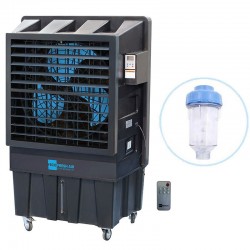 Questo raffrescatore evaporativo ha un consumo elettrico di 1500 W e il consumo d’acqua è pari a 18÷20 L/h, inoltre il serbatoio dell’acqua ha una capienza di 126 L con indicatore livello acqua.