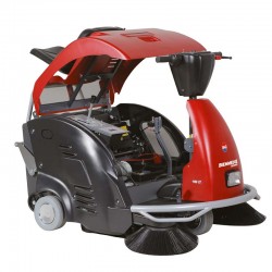 Il design della spazzatrice include caratteristiche come ruote anti traccia, ganci di sollevamento e un faro anteriore con predisposizione per lampeggiante. Il cofano totalmente apribile semplifica le operazioni di manutenzione interna, assicurando un facile accesso ai componenti principali.