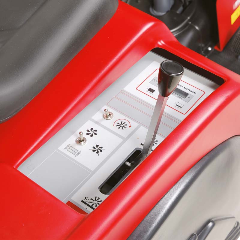 Questa spazzatrice uomo a bordo è in grado di lavorare su pendenze del 12% e raccoglie i detriti in un capiente cassetto dei rifiuti da 65 L. La sua velocità di avanzamento è di 5,2 km/h.