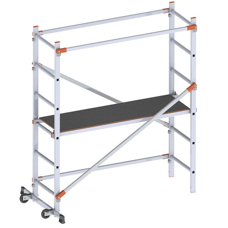 La struttura portante del trabattello in alluminio è realizzata con telaio saldato, garantendo rigidità strutturale e lunga durata anche in condizioni di utilizzo intensivo. L’altezza della struttura di 1,81 m assicura un equilibrio ottimale tra compattezza e stabilità.